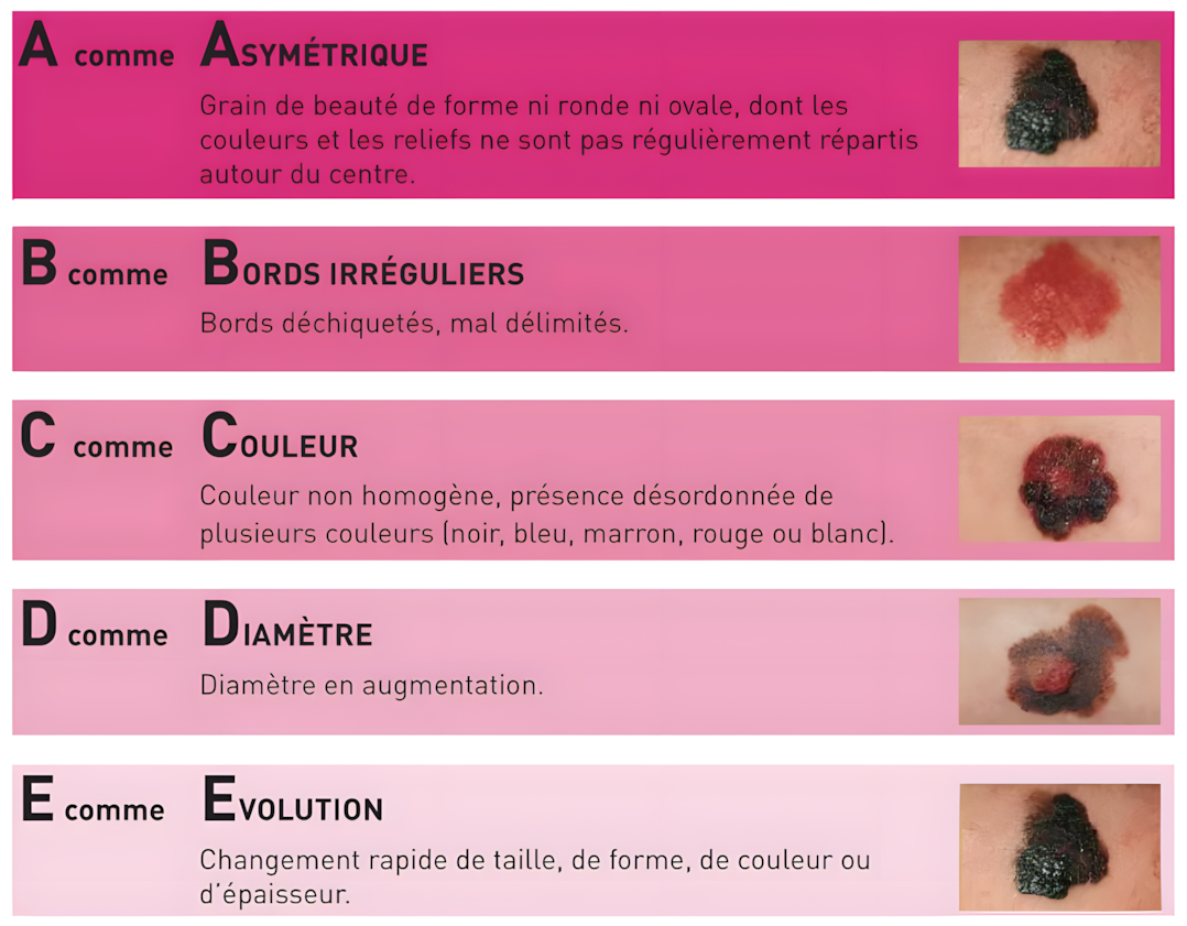 Signes à surveiller : Apparition ou modification d’un grain de beauté (règle ABCDE : Asymétrie, Bords irréguliers, Couleur non uniforme, Diamètre > 6 mm, Évolution), plaie qui ne guérit pas, ou tache cutanée inhabituelle.